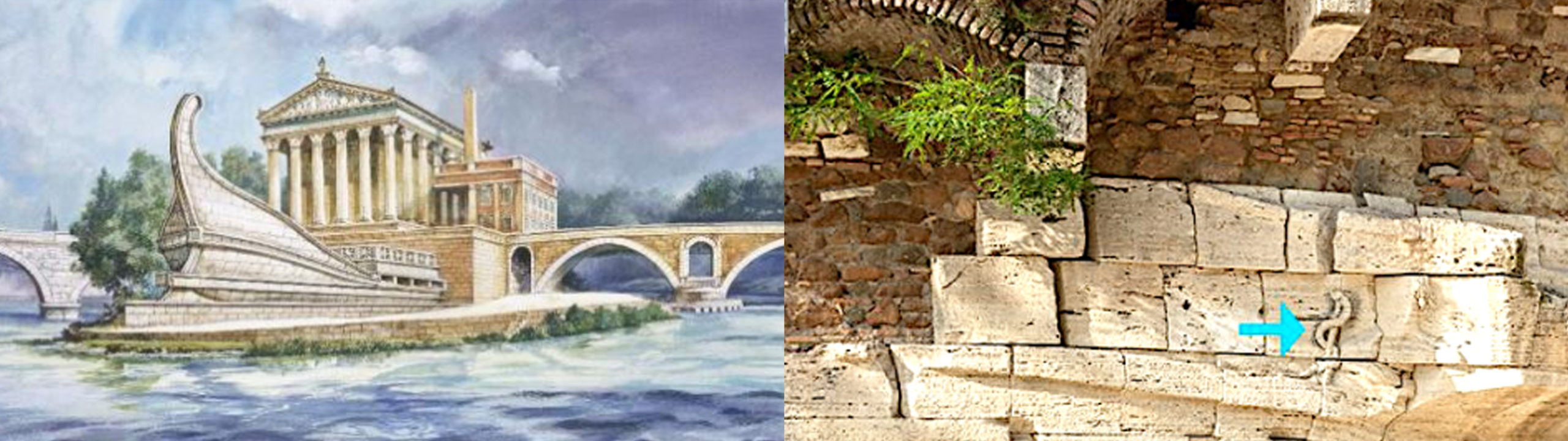 Digressione → La leggenda del serpente del dio Esculapio all’Isola Tiberina. Il mito narra che nel 293 a.C. scoppiò a Roma una terribile pestilenza che mieté moltissime vittime tra la popolazione. Per farla cessare vennero consultati i Libri Sibillini, testi oracolari a cui si ricorreva in caso di grave pericolo per la città. Il responso fu che, per interrompere la pestilenza, era necessario recarsi a Epidauro, nel Peloponneso, dove si trovava il più grande santuario dedicato al dio della medicina greca, Esculapio. Così una delegazione partì alla volta della Grecia e, a bordo di una nave da guerra, giunse al tempio di Epidauro per ottenere soccorso. Mentre si svolgevano i riti propiziatori, un grosso serpente uscì dal tempio e si rifugiò proprio sull’imbarcazione romana. I membri della delegazione furono certi che Esculapio si fosse trasformato nell’animale e si affrettarono a ritornare a Roma. Verso la fine del viaggio, risalendo il Tevere, la nave arrivò in prossimità dell’Isola Tiberina: proprio allora il rettile scivolò via dall’imbarcazione nascondendosi tra le rocce dell’isola. I Romani non ebbero dubbi: era il segnale della volontà del dio Esculapio di voler erigere, proprio in quel luogo, un tempio in suo onore. Nel 289 a.C. venne quindi eretto il santuario sulla punta meridionale dell’isola e, secondo la narrazione, l’epidemia cessò improvvisamente. Di questa mitica storia rimane ancora oggi, sulla punta orientale dell’isola, una traccia molto importante: i resti della poppa di una nave in travertino (creata dai Romani sagomando le rocce dell’isola) su cui appaiono visibilmente un bastone e un serpente, tipici attributi di Esculapio.